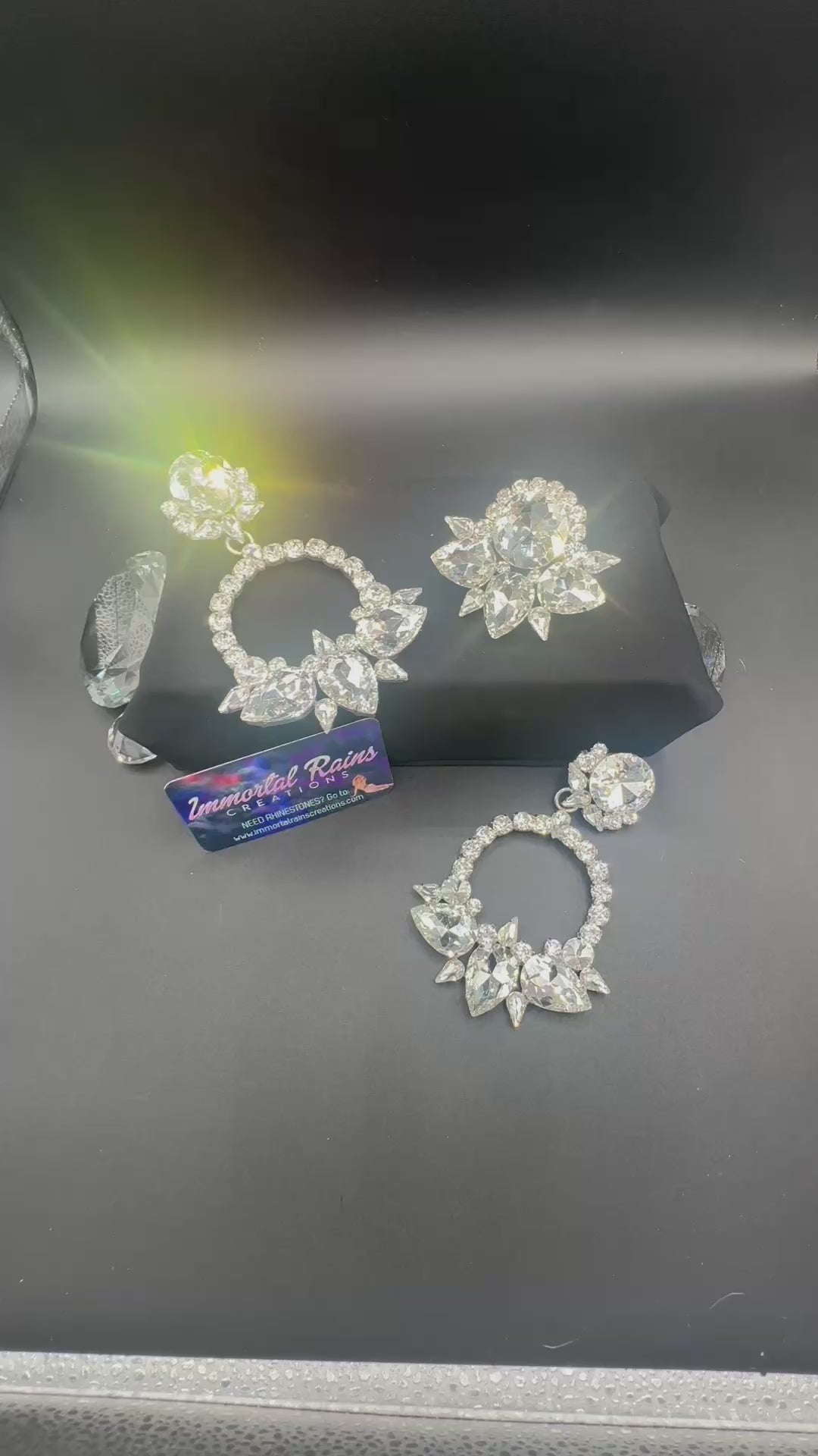 Included are a set of two piece detachable earrings with clips and a wide band adjustable ring.
