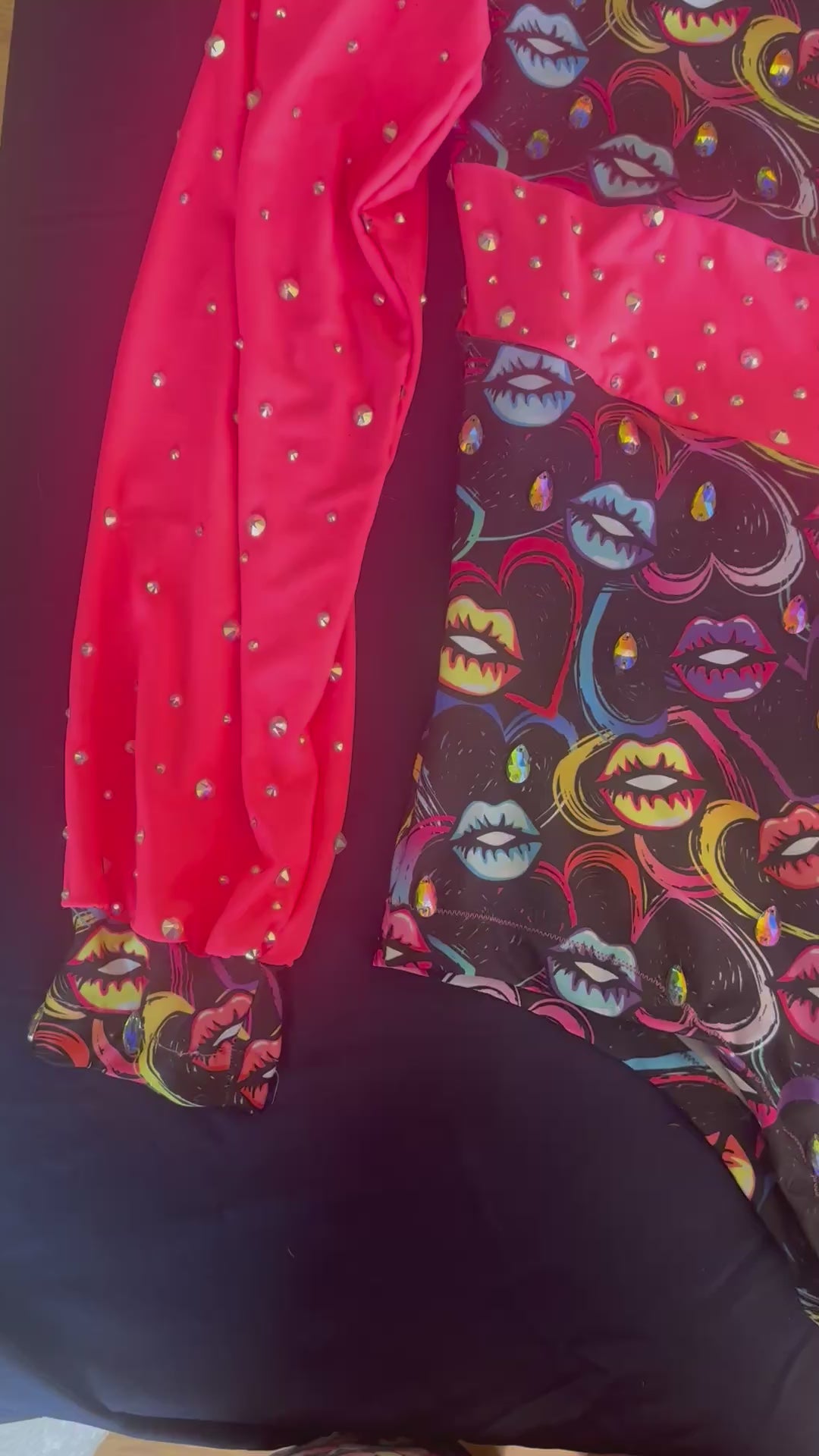 MUAH! this sikkkkning leotard is hand made with thick, 4 way stretch, quality fabrics, an invisible zipper, and a beautiful design featuring flowy sleeves and a form fitting bodice. She is stoned with high quality crystal AB and sewn on teardrop rainbow glass rhinestones.