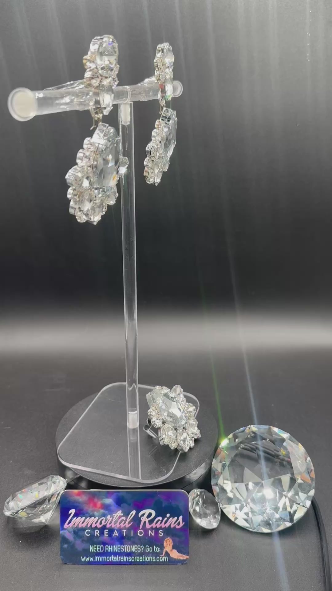 Featuring a pair of two-piece detachable earrings and a healthy sized matching ring this beautiful jewelry set STUNS, and is called The Fan Favorite for a reason! This is one of our most popular designs for pageants, shows, photoshoots, and more!